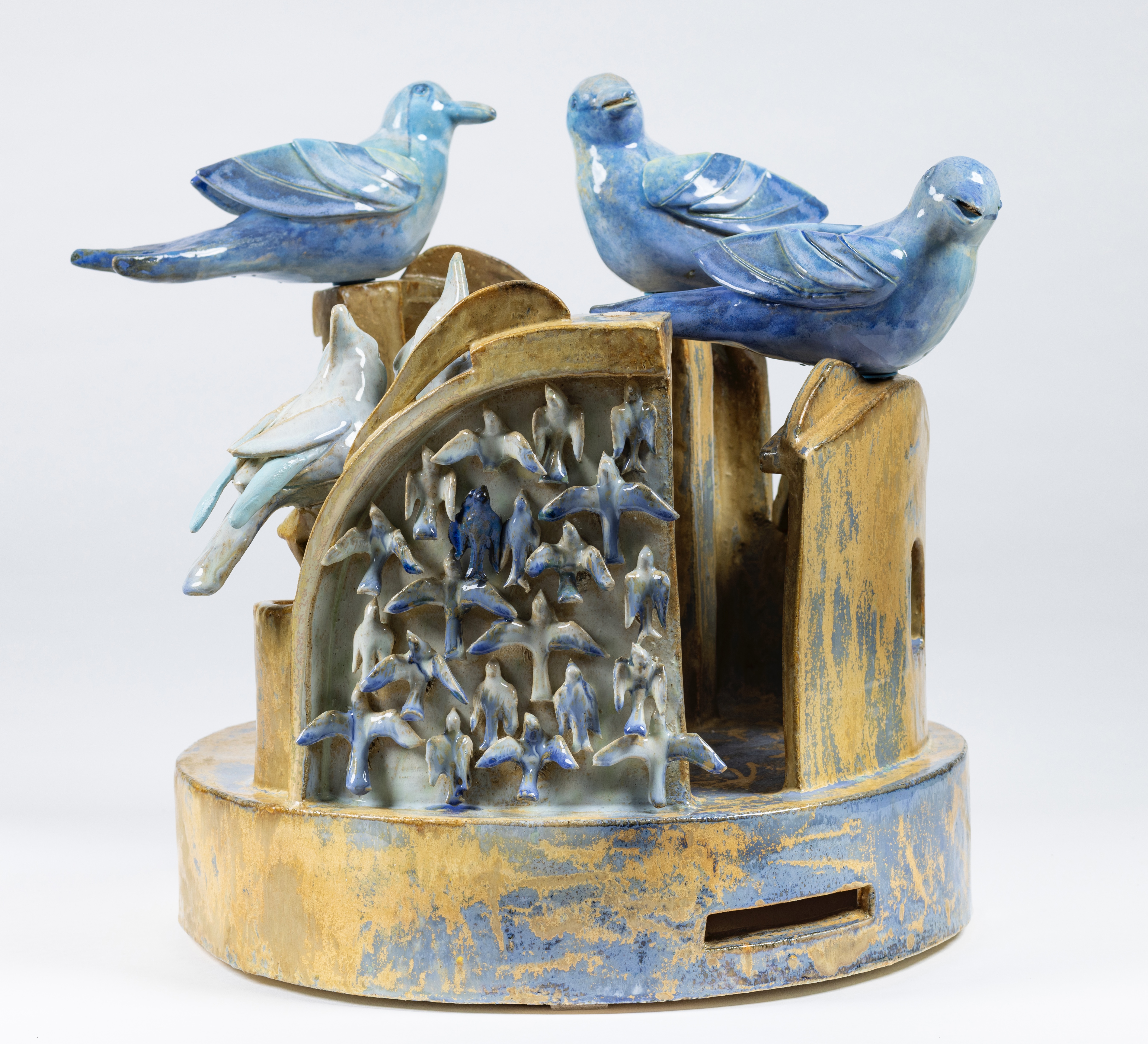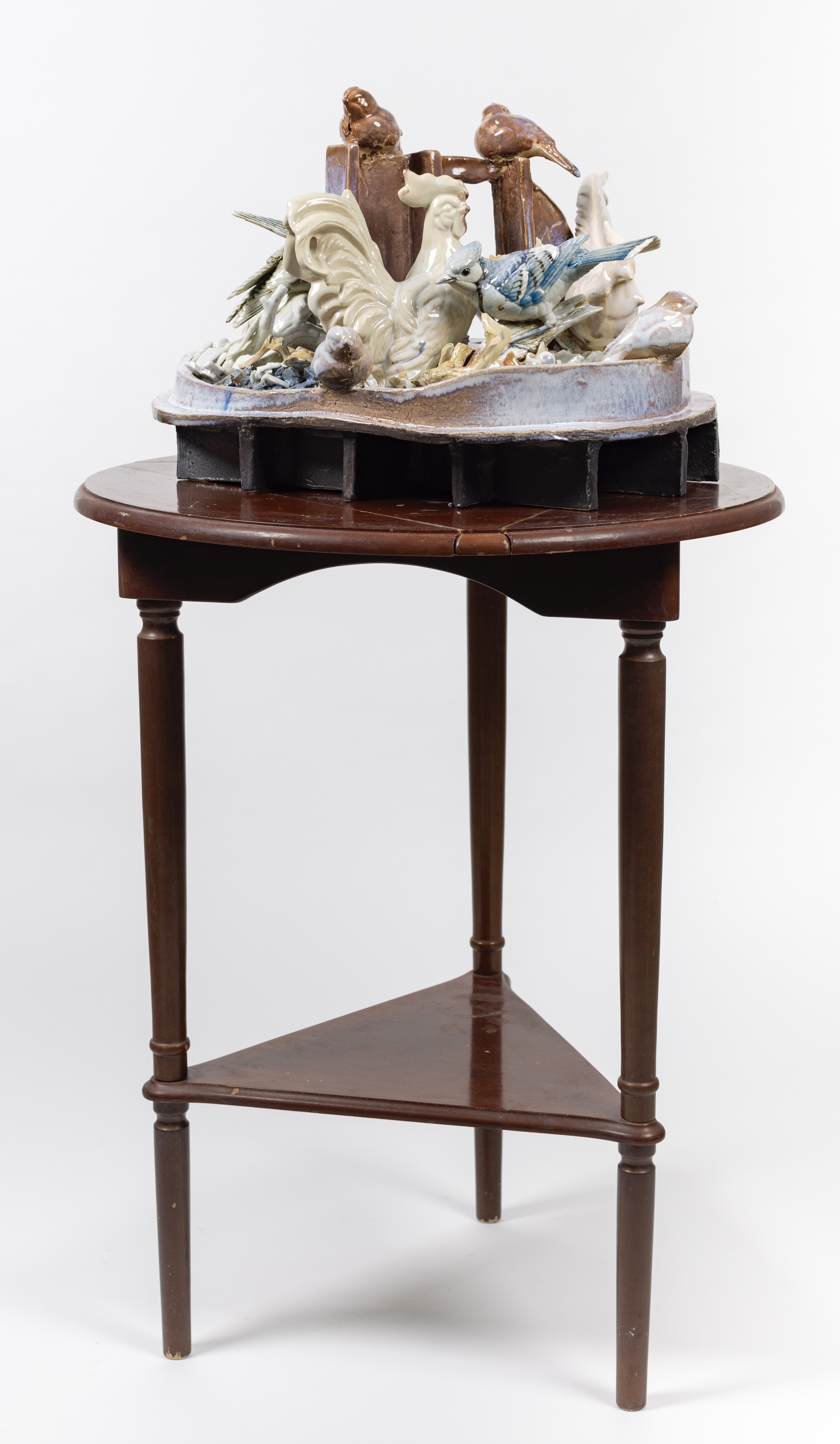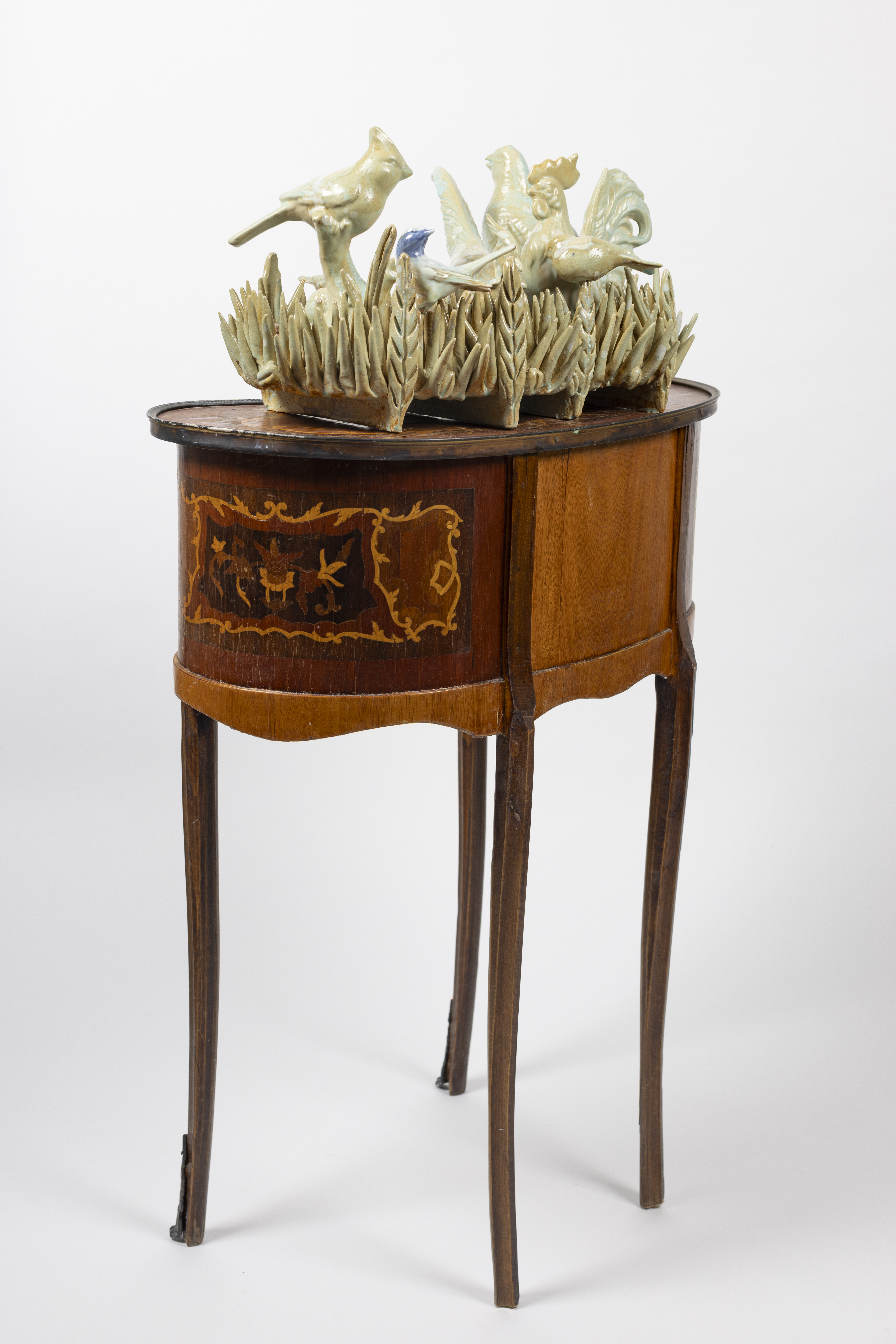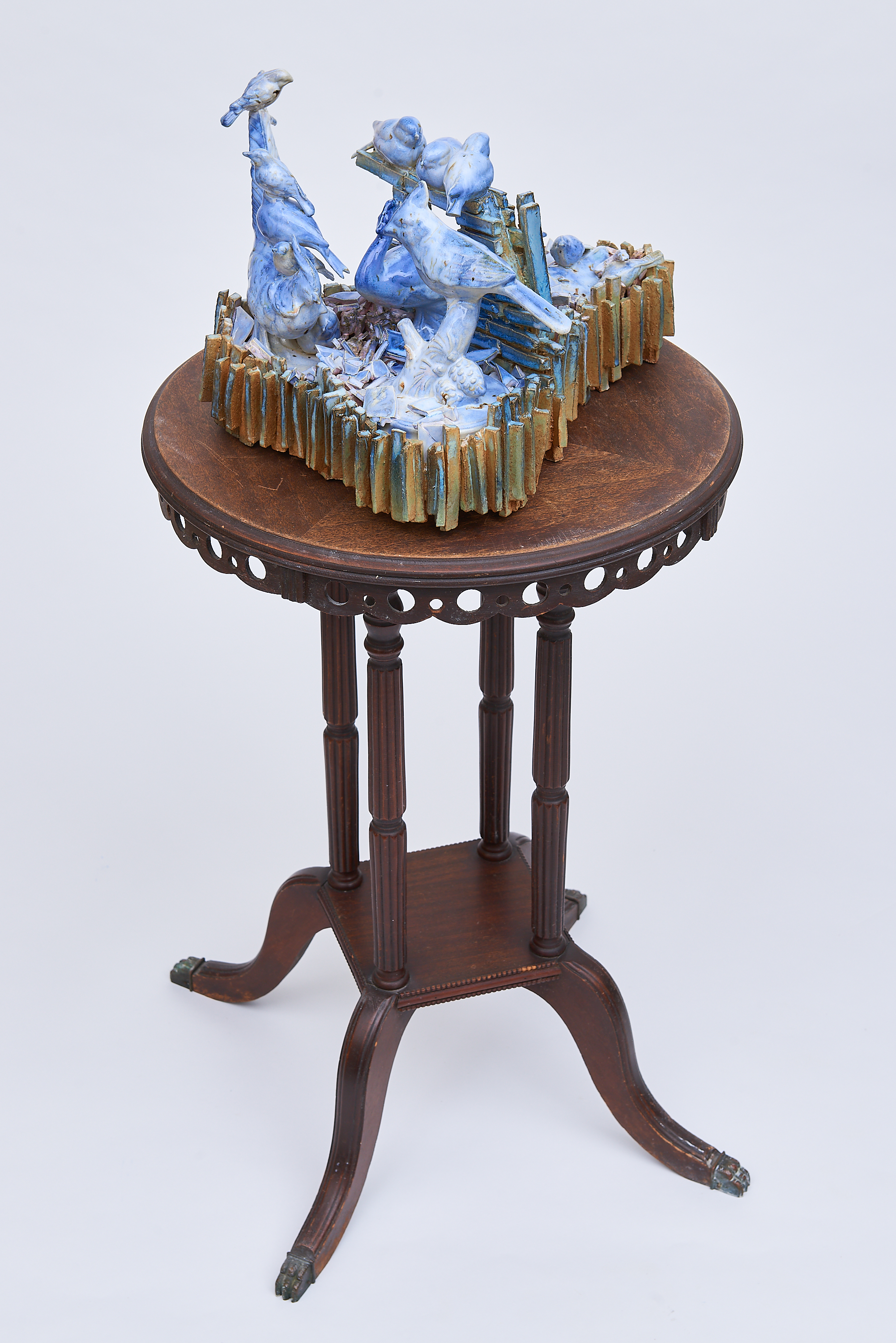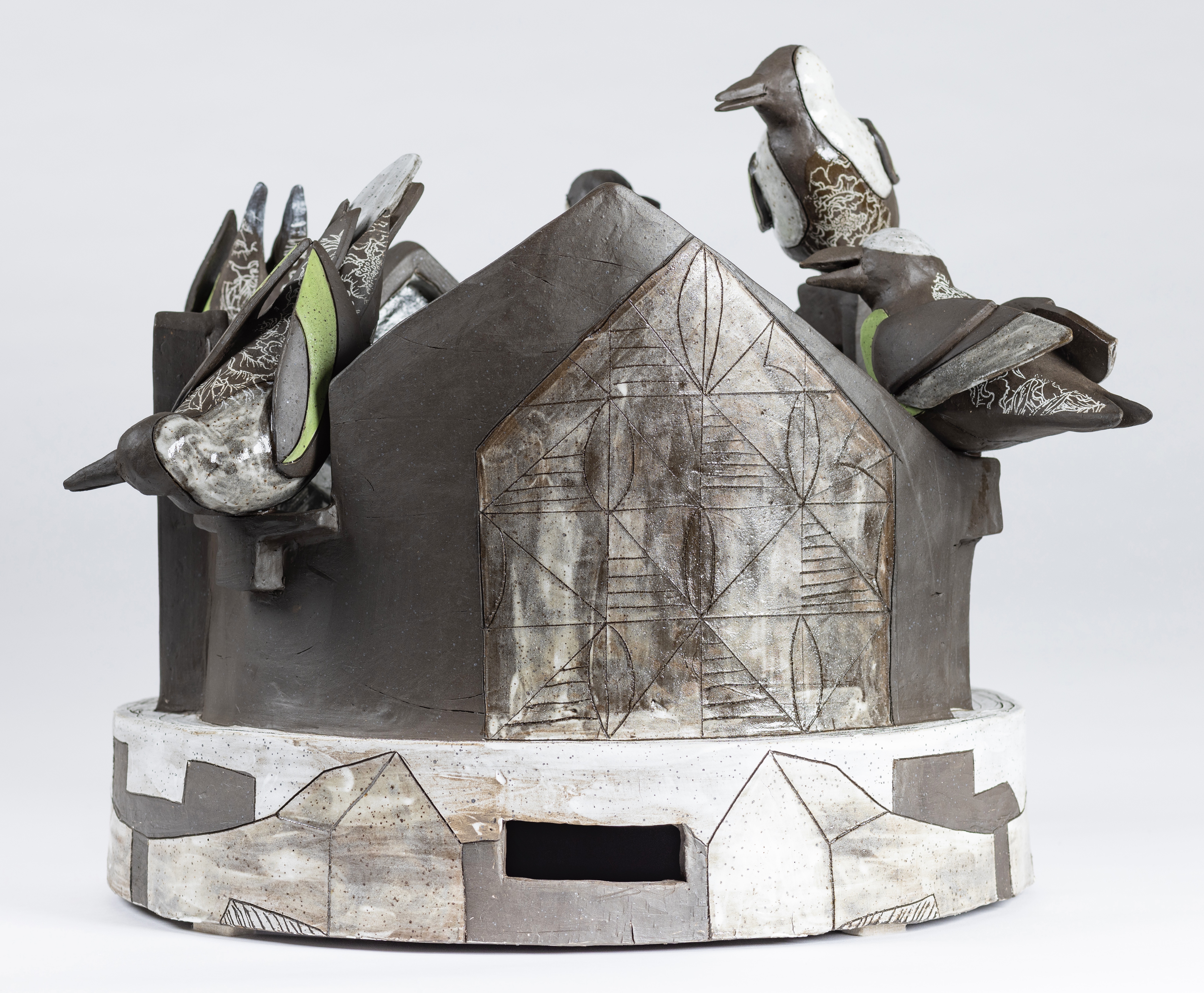Several of the bird formations and clusters are displayed on side tables from the turn of the 20th century to reflect beauty, peace, a harmony of being, and home. In bell hooks’s book titled, belonging, (1) she refers to a visit to an art gallery in San Francisco, where she saw rooms arranged by Buddhist monk Chögyam Trungpa. (2) He reminded hooks to look carefully at the objects in the gallery. Trungpa states, “Objects are not without spirits. As living things, they touch us in unimagined ways.” Thompson installs her work on repurposed tables specifically for this reason, in that they recall memory of home, whether that be her mother’s, grandmother’s or a close auntie’s house. Thompson’s bird formations symbolize and carry messages of intimacy, liberation, resilience, loss, restorative, transcendental, and rebalancing the world. Birds migrate to places searching for greater resources for food, warmer climates, and breeding to populate their species. The great migration of African Americans moved from the deep south to northern cities for better resources, such as job opportunities, education, and home security. However, for Black people were pushed to leave their homes because of the constant threat of Jim Crow Laws (3) and left seeking better living conditions in northern cities. The excerpts from the interviewees’ personal stories serve as examples to these migration patterns.