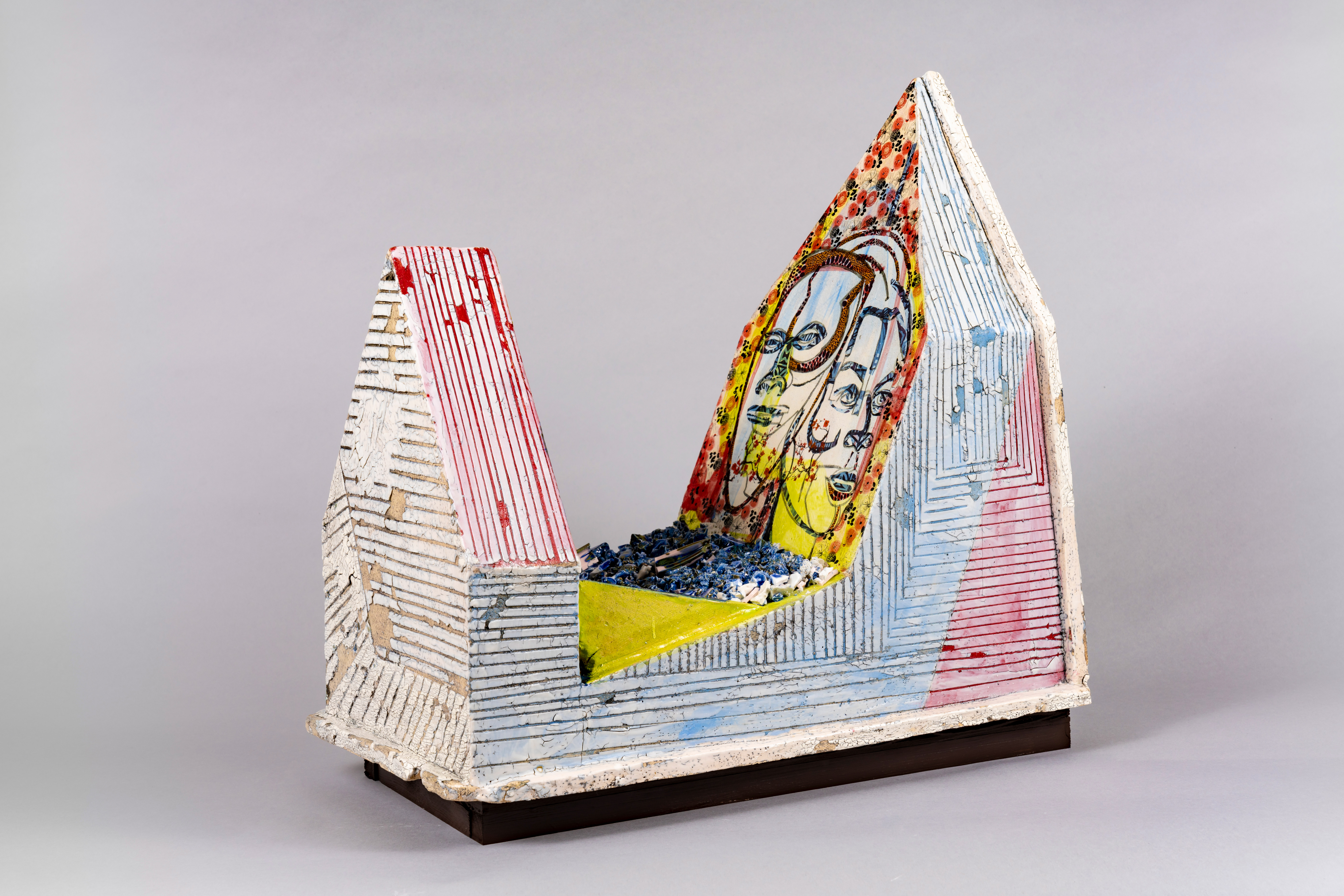 This work explores a person’s relationship to the culture in which they find themselves, while retaining their identity partly through their taught traditions and ancestors. She combines interior/exterior frames of structures resembling enslaved and track houses to create images that reference the continuous cycles of forced evictions, upward mobility, contagions, deaths and gentrification. She infuses reclaimed ceramic objects that reference multiple cultures produced at ceramic factories through the world’s industrial working class. Just as plants and animals migrate and deposit resources throughout their life cycles, humans migrate with objects and leave behind their objects that take on new meaning. This work depicts the responsibilities people hold to places, as witnesses of evolving communities.